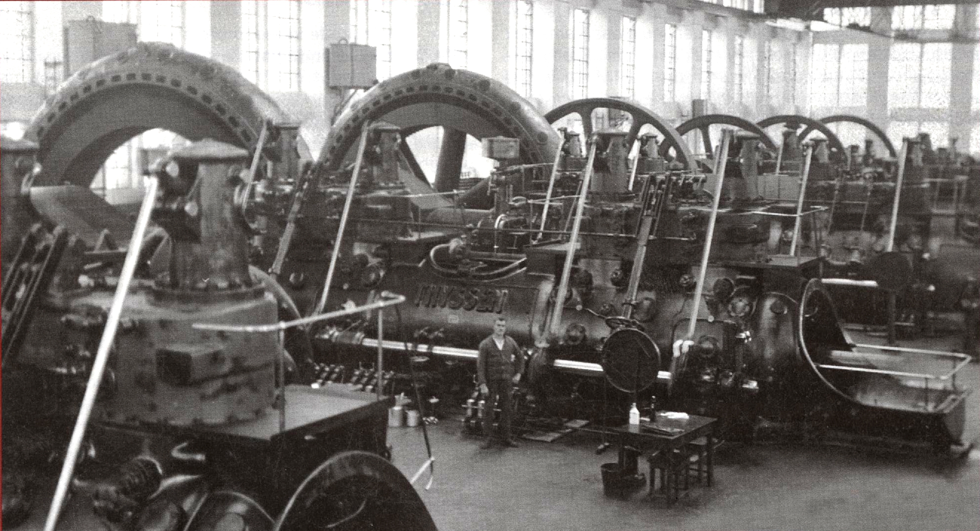 Wegen Absatzschwierigkeiten der metallurgischen Erzeugnisse fehlte das Geld für die Weiterführung der Investitionen. Nach fast 2jähriger Unterbrechung konnten die Arbeiten am Bau der Gasmaschinenzentrale erst 1926 weitergeführt werden. Ab diesem Jahr wurden die Gasreinigung und das Schalthaus errichtet. Im Jahr 1928 waren alle 7 Großgas- maschinen aufgestellt. Die Restarbeiten zogen sich aber noch bis in das Jahr 1929 hin. PLG_GSPEECH_SPEECH_BLOCK_TITLE Bemerkungen zur Entwicklung und zum Bau von Großgasmaschinen Im Jahr 1921 beschloss der Aufsichtsrat den Ausbau der Maximilianshütte Unterwellenborn zu einem gemischten Betrieb. Der Bau des Industriekraftwerkes Gasmaschinenzentrale entsprechend den Gegebenheiten im Umfeld der Maxhütte und für den zu erwartenden Umfang der Produktion wird wichtiger Bestandteil der Ausbaumaßnahmen. Mit dem Bau der Gasmaschinenzentrale sollte das als Abprodukt anfallende Hochofen Gichtgas kostengünstig zur Energiegewinnung genutzt werden. Am 02. November 1921 wurden die 3 MAN-Maschinen für die Hochofen-Windversorgung und am 28. November die 4 Thyssen-Maschinen für die Stahlwerk-Windversorgung bzw. Elektroenergieerzeugung bestellt. Der Gasmaschinen- bau stand zu dieser Zeit in Deutschland in voller Blüte. Sowohl in der Chemieindustrie als auch in Hüttenwerken wurden die von Hans Richter entwickelten Großgasmaschinen als Antrieb für Kolbenverdichter und Generatoren eingesetzt. Ihre Entwicklung und Bau sind Ausdruck hoher ingenieurtechnischer und handwerklicher Leistung. Als Baubeginn für die Maschinenhalle ist in den Unterlagen Januar 1922 angegeben. Gleich zu Beginn der Bauarbeiten ist ein Anschlussgleis an das Werkbahnnetz gelegt worden. Ein Jahr später stand der Rohbau und im Oktober 1923, in der Zeit der höchsten Inflation in Deutschland, ist das Dach mit Rahmenbetonteilen gedeckt worden. Die Maschinenhalle wurde in freitragender Skelettbauweise von Handwerksbetrieben der Region errichtet. Damals war sie 95 Meter lang und 33 Meter breit. 1948 - 1950 wurde sie auf der Westseite auf 121 Meter verlängert. Um das hohe Eigengewicht der Maschinen (Dynamo III z.B. 315 t) und die hohen Belastungen durch die Expansions- kräfte aufnehmen zu können, mussten die Fundamente weit in das Erdreich gegründet werden. In Bedienungshöhe der Maschinen wurde zwischen den Fundamenten die Maschinenhausdecke errichtet. Die Montage erfolgte mit dem 40 t Kran der Firma MAN. Wegen Absatzschwierigkeiten der metallurgischen Erzeugnisse fehlte das Geld für die Weiterführung der Investitionen. Nach fast 2jähriger Unterbrechung konnten die Arbeiten am Bau der Gasmaschinenzentrale erst 1926 weitergeführt werden. Ab diesem Jahr wurden die Gasreinigung und das Schalthaus errichtet. Im Jahr 1928 waren alle 7 Großgas- maschinen aufgestellt. Die Restarbeiten zogen sich aber noch bis in das Jahr 1929 hin.